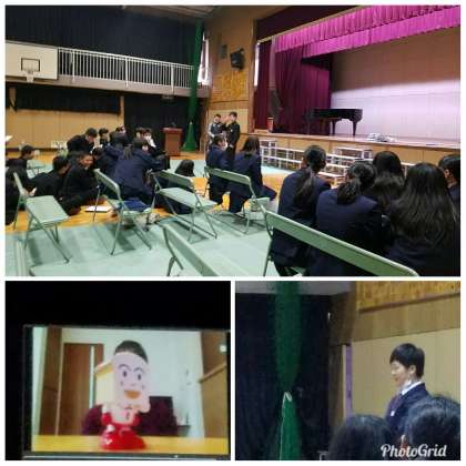 3月9日(金)卒業式の練習後、午後から体育館で3年生お別れ会を行いました。自主的に卒業委員会を立ち上げて、1年生入学の写真などをビデオ編集して上映してくれました。1年生の時の幼い顔立ちから、3年間でずいぶんと成長しました。3年生の生徒何人かと先生方で順番に前でみんなに話をしました。卒業まであと2日です。