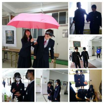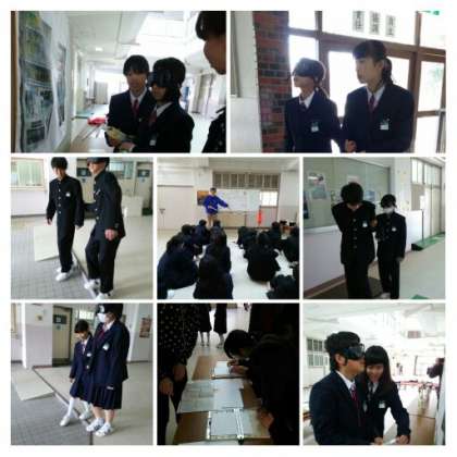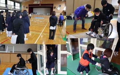 港区社会福祉協議会、南部包括支援センター、地域のボランティアのご協力をいただき、福祉体験学習を行うことができました。今回は、視覚障がい者手引き体験と車いす体験です。相手の立場になって行動することの大切さを学び、手助けの必要な人に対して今の自分に何ができるかを考えて、実際に行動できる人になってほしいです。
