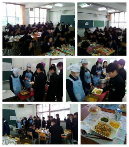 給食当番が手際よく配膳し、グループで楽しく食べています。