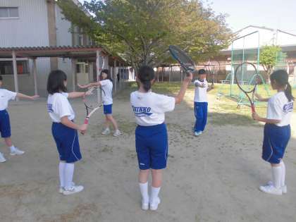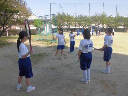 こちらはテニス部とバレー部です。テニス部は素振りの体験を、バレー部は体験前にお互いに自己紹介をしていました。