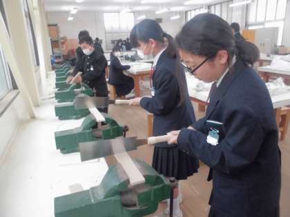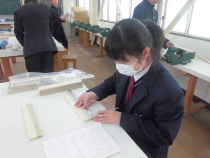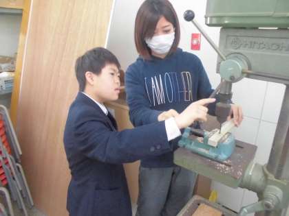 2年生は技術の時間に木製のイスを作っています。製図したり、のこぎりで切ったり、卓上ボール盤で穴をあけたりと、本格的な作業をしています。ケガには気をつけてくださいね。