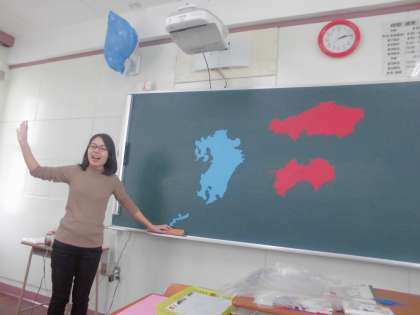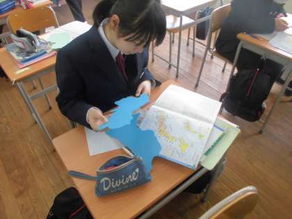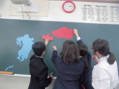 社会の授業では日本の地理を勉強しています。この時間は、大きな日本地図のパズルが配られ、自分でそれが何県かを調べ、みんなで協力して黒板に貼っていくという内容でした。協力のかいあって、無事に西日本が完成しました!