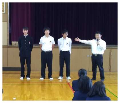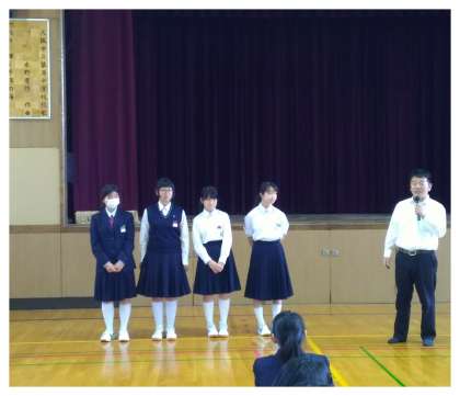 生活指導担当の堺先生からは、明日から始まる更衣調整期間の服装についての諸注意がありました。生徒会役員さんたちをモデルに色々なパターンの服装を紹介してくださいました。