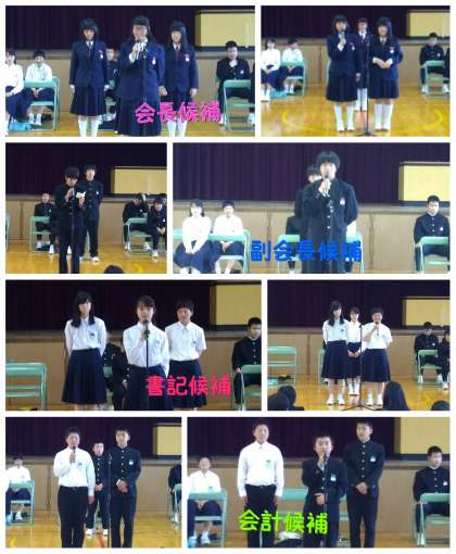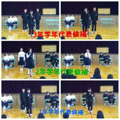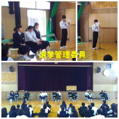 5月1日(火)6限、前期生徒会役員選挙・立会演説会がありました。先週、2年生はインフルエンザで学年閉鎖だったため、今日に延期になっていました。