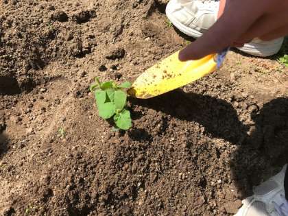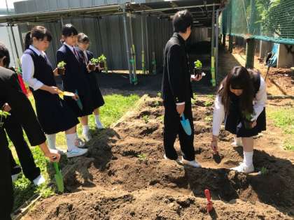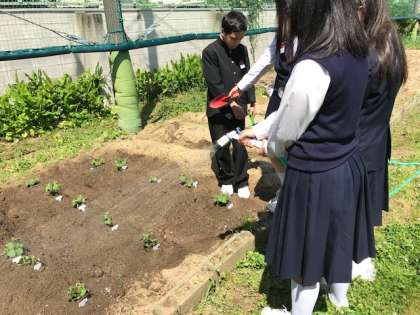 3年生技術では授業で「枝豆」を栽培しています。4月にポットにまいた種が発芽して、畑に定植しました。7月の収穫が楽しみです。