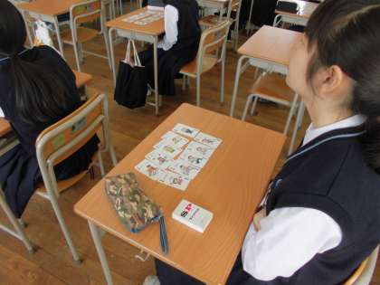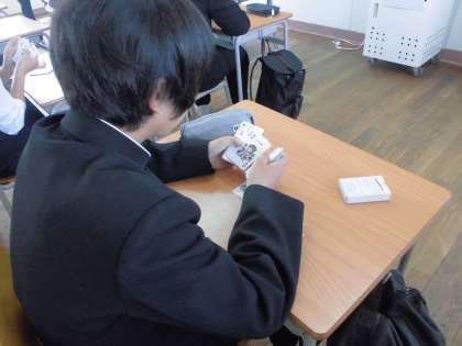 2組はヒューマンアカデミーから講師の先生をお招きし、SPトランプの授業を受けました。SPとはサブ・パーソナリティの略で、自分でも知らない自分の個性を知り、その個性に合った職業を調べるという内容でした。意外な人が実は控えめだったりと、いろいろな驚きと発見がありました。