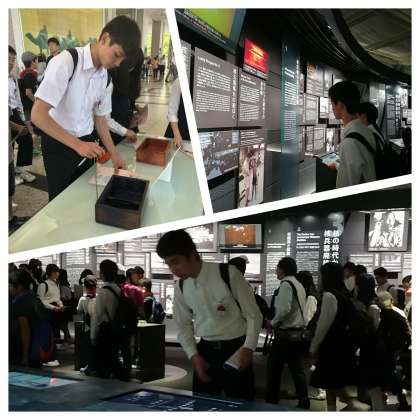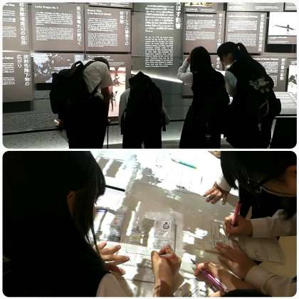 平和記念資料館では、各班がそれぞれ調べるテーマを決め、しおりを片手にみんな熱心にまわっていました。ここでしかない展示品や当時の写真など、貴重なものを見ることができました。