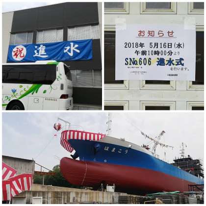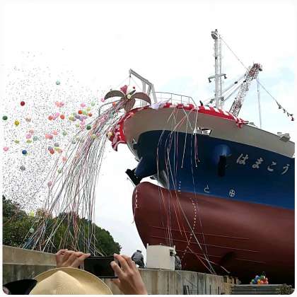 船の名は「はまこう」とお披露目。船の安全を祈る神事のあと、餅まきもあり、着水!感動的な進水式でした。