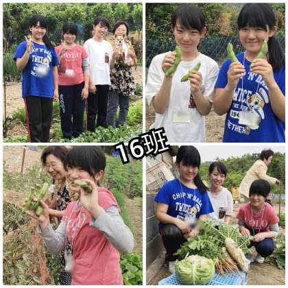 16班は自家菜園で野菜の収穫中。見たこともないような大きな豆をもぎ、大根を土から抜かせてもらいました。キャベツを収穫時に出てきた大量のナメクジにも平然としていました。無農薬野菜、美味しそうです!