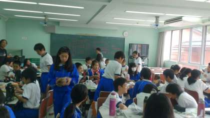 心配していた雨にも合わず、無事にオリエンテーリングは終了しました。次のプログラム、クラフトスライスチップ「おもいでプレート」制作中です。
