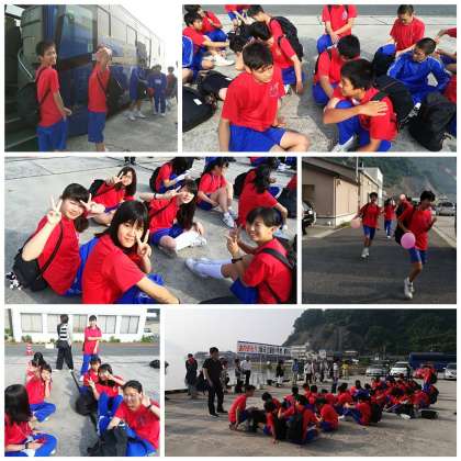 離島式前のただいま7時半過ぎ。続々と民泊班に分かれた生徒たちが、車で到着してきてます。