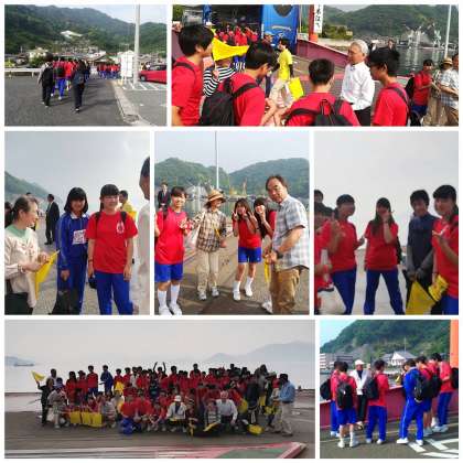 離島式会場から港への移動中、それぞれの体験を話しながら和気あいあいとクラスごとに移動しました。