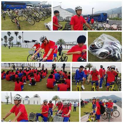 まずは自分に合った自転車、ヘルメット選び。その後、説明を聞きます。
