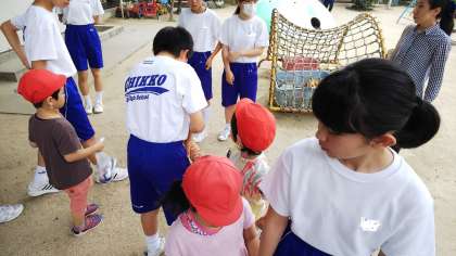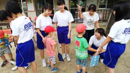 2年生は、5月17日(木)の2・3限目、家庭科の時間に保育体験をしました。築港保育園に園児さんを迎えに行き、一緒に手をつないで中学校まで歩きます。初めは緊張していた中学生と園児さんでしたが、すぐに打ち解けて仲良く歩いていました。