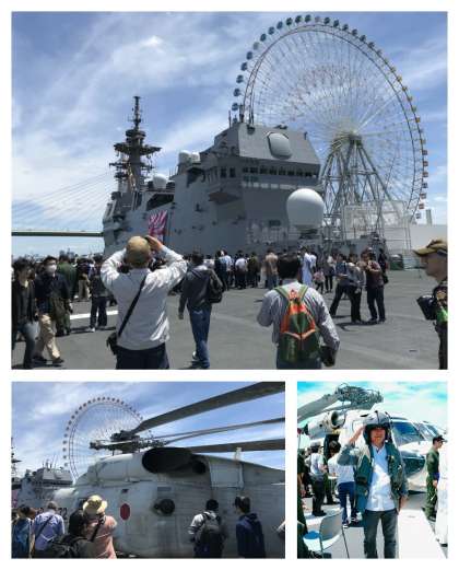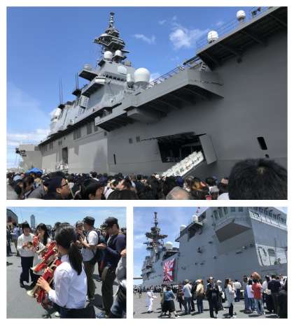 5月20日(日)天保山に海上自衛隊の最新鋭艦「かが」がやってきました。多くの見学者が集まり、入場に2時間程度かかりましたが、ヘリコプター昇降用エレベーターに乗り、そこを降りると、広い甲板が現れました。甲板ではヘリコプターの展示や、手旗信号、起床ラッパなどのパフォーマンスもあり、気持ちの良い見学会でした。本校の生徒および保護者のみなさんも多数見学に参加していました。