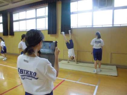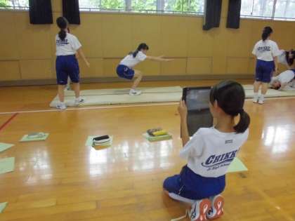 体育の授業でマット運動をしている様子です。倒立と倒立前転の練習をタブレットで撮影し、後でみんなで検証をします。自分の演技がすぐに見られるので、とても参考になりました。