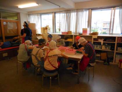 あいらぶ工房です。今日は施設の方々と一緒に薬容器の箱詰作業をしました。