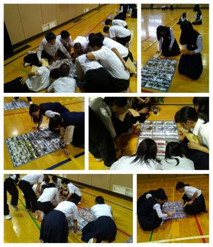 6月6日(水)総合の時間、修学旅行に同行した写真屋さんが撮影した写真を見ました。とてもたくさんあったので、体育館に敷き詰めて見るのことになりました。約40分間の時間でも足りないと言う人もいたほど、みんな熱心に見ていました。