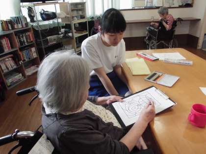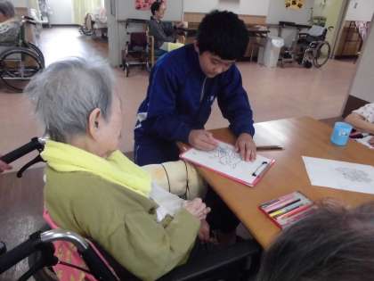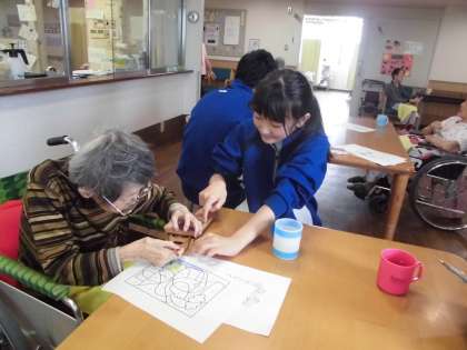 愛港園です。入浴前のひと時に、入所者の方と一緒に塗り絵をしました。みなさんがどこまで作業ができるかを見極めながら、最適なサポートをするというとても経験が必要なお仕事でした。戸惑うことが多かったですが、一緒に楽しくできたように思います。