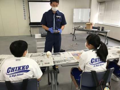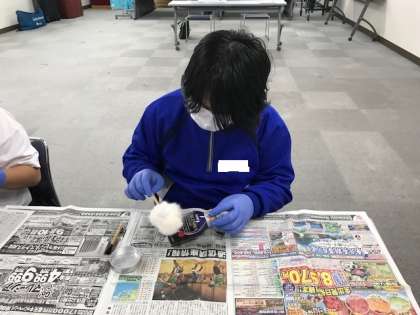 海上保安監部です。こんな体験ができるところは他にないでしょう。なんと指紋採取をしています。試薬を使って指紋を浮き上がらせるという鑑識業務体験をしました。きっと思い出に残る一日になったのではないでしょうか。