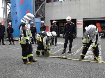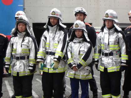 消防署では、本物の消防服を着て放水訓練を体験することができました。消防服はとっても重たかったですが、本当にいい記念になりました。消防隊員のみなさまのご苦労と有難さがとてもよく分かりました。