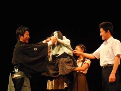 途中の文楽鑑賞教室では、人形の操作を、代表として3年生の上久君が大学生小学生と3人で見事に操作しました。