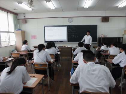 数学科は、1年1組で習熟度の3クラス展開の授業です。単元は【文字式の利用】で、ICTレベル、内容ともに異なった授業を展開しました。