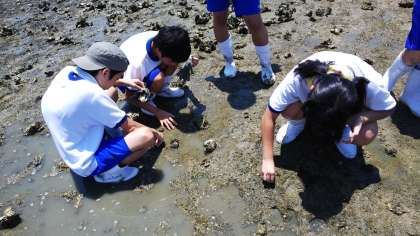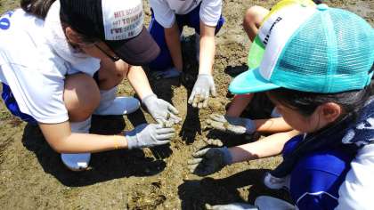 頑張った甲斐があって、カキ礁の山ができました。最後はカニとたわむれて帰りました。暑い中、本当にお疲れ様でした。