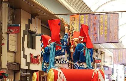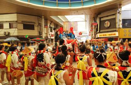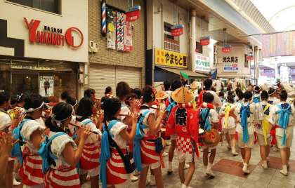 毎年恒例の三津神社祭礼を見学するため、八幡屋商店街に行ってきました。卒業生を含め本校の生徒が多数参加し、汗を流しながら頑張っていました。笛と獅子舞と太鼓が見事に合わさって、大勢の見物客を引きつける圧巻の演武でした。