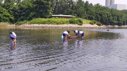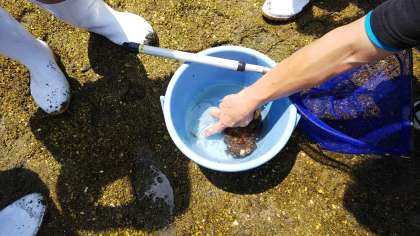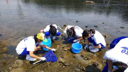 海遊館連携授業で干潟の生物調査をしました。まずはバケツと網を持って、干潟と、前回作ったカキ礁の周辺の生物を採集しました。カニや貝、小さなエビなどたくさんの生物を見つけることができました。