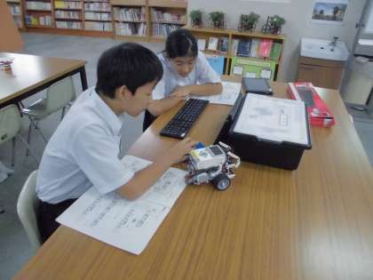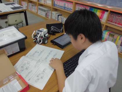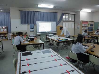 1年1組Bの技術の様子です。ロボットを使ってプログラミング学習をしています。