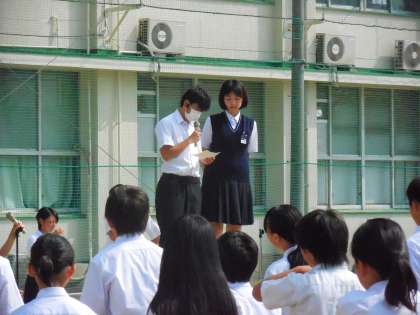 6月〜7月に実施した清掃点検の結果が3年生の整備・美化委員会が報告しました。1年生はもう少し細かいところまできれいにする。2年生はきれいに掃除ができていた。3年生はだいたいきれいにできていた。という内容でした。