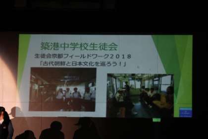 生徒会役員は、夏休みに社会科の先生方と「古代朝鮮と日本の文化を巡ろう!」というテーマで京都の嵐山へ行きました。その様子をスライドで紹介してくれました。