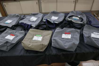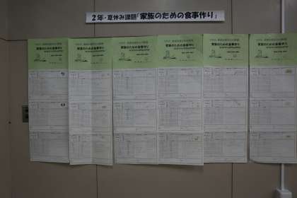 家庭科は、夏休みの宿題作品です。1年生はリバーシブルの手さげ袋の展示もありました。
