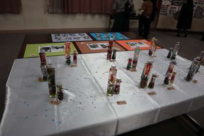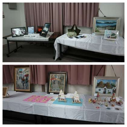 社会見学で作成したハーバリウム、PTA保護者の皆さまの美術などの作品展示、PTA広報委員会の写真入り壁新聞など大作がいっぱいでした。