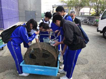 11月10日(土)10:00から海遊館連携授業の一環として天保山岸壁調査を行いました。6人の生徒が参加してくれました。約2ヶ月沈めておいたものを引きあげ、どんな生物がいるか調査をしました。生徒たちは興味津々で、ピンセットで生物をとり、顕微鏡で観察するなど、海のいろいろな生物を肉眼で観察でき非常に楽しい学習をさせていただきました。29種類の生物を観察することができました。