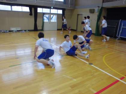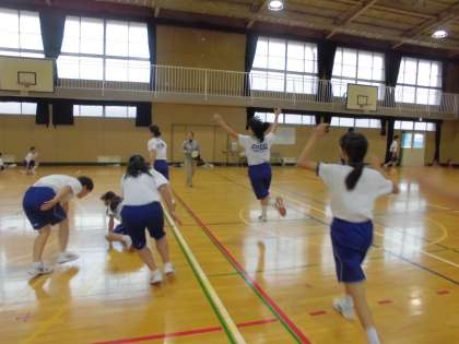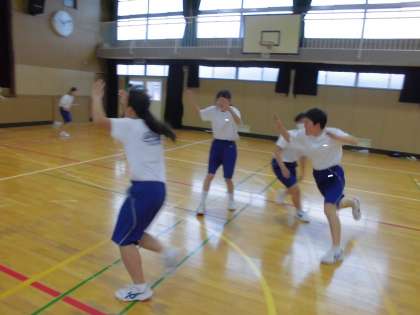 最後は4人グループになって、先頭の人が新聞になったつもりでいろいろな動きをし、後の3人がそれを真似しながら追いかけます。楽しそうな歓声をあげながら、体育館を所狭しと走り回っていました。