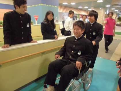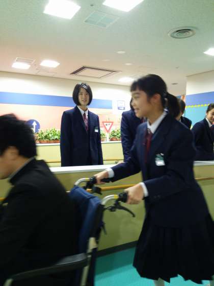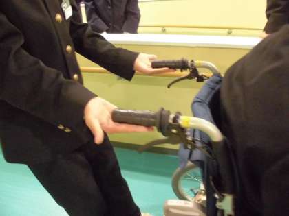 続いて電動の車イスの体験です。坂道でも電気の力で楽々と押すことができました。老々介護が問題視されている現在、とても需要があるのではないでしょうか。