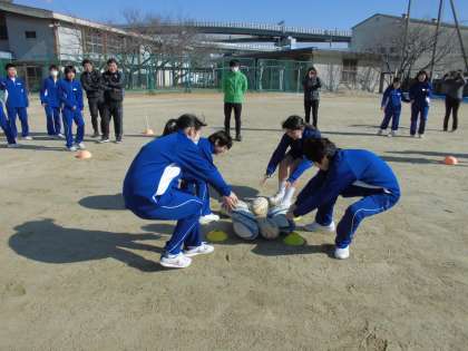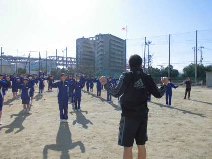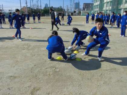 3限目はグラウンドでラグビー体験です。みんなで体操してから、ラグビーボールの取り合いゲームをしました。