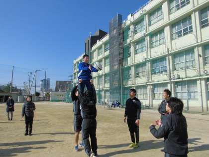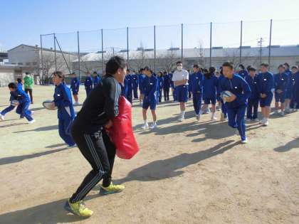 続いてタックルの体験と高いところでパスを受ける体験です。みんな優しいので、そーっとタックルしていました。