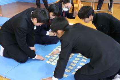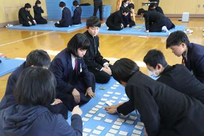 上の句で札を取る人が去年よりも多かったように思います。どの場も接戦・熱戦が繰り広げられていました。寒い格技室でも汗ばむほどのみんなの熱気がありました。さて勝敗はいかに!?