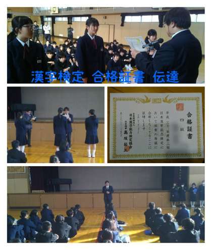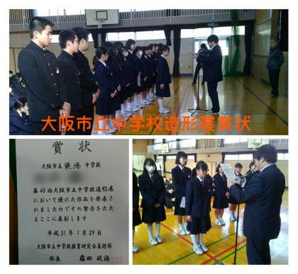 全国教育美術展で特選の表彰、大阪市中学校造形展の参加表彰、漢字検定合格証書伝達がありました。