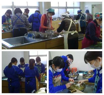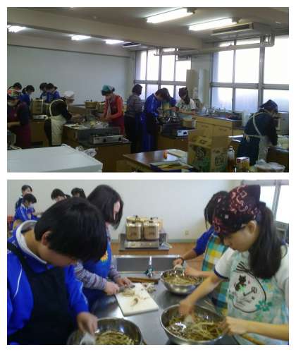 調理室では炊き出しの「豚汁」を元気アップやPTAの方々が作っていただいています。この作業を3年生の卒業プロジェクト有志メンバーがお手伝いボランティアとして活躍しています。