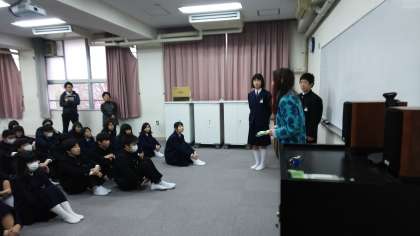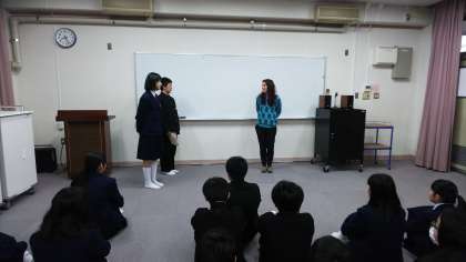 今日の学年朝礼では、英語のシェイダ先生にお礼のあいさつをするというセレモニーがありました。委員長が代表して英語であいさつをし、みんなが書いたメッセージを手渡しました。シェイダ先生からもお礼と励ましのメッセージをいただきました。
