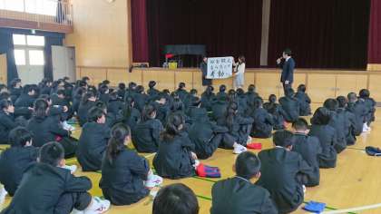 2年生は、3時間目の学年集会で2年生の先生方が考えた学年目標の発表がありました。2年生の学年目標は「心を鍛え、自らすすんで考動する」です。
