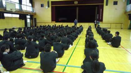 3年生の学年集会の様子です。 山田先生から集団力のお話がありました。