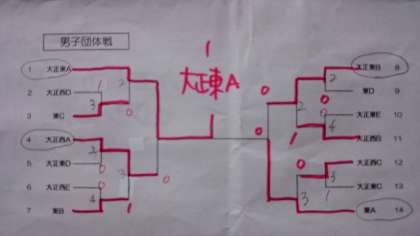 東中学校Aとの決勝戦は、2試合ともファイナルゲームにもつれ込みましたが、7−5と7−3でとり、いずれもゲームカウント3対2となったため、第三試合開始前に2−0で勝利し優勝が決まりました。