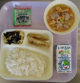 ごはん 牛乳 きびなごてんぷら 豚汁 わかたけ煮 ソフト黒豆