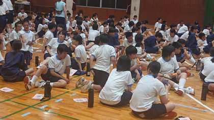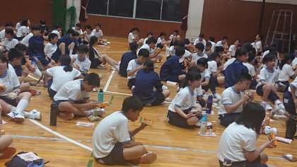 レクリエーションの後、みんなで菓子パンとジュースを食べています。