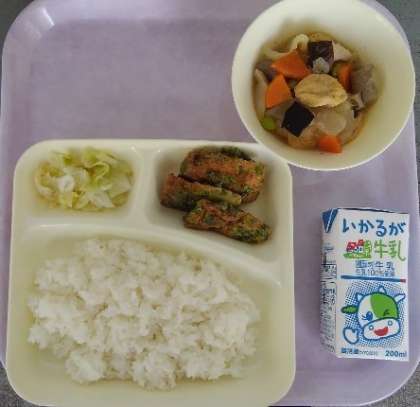 ごはん 牛乳 ちくわのいそべあげ 鶏肉と一口がんもの煮もの あっさりキャベツ